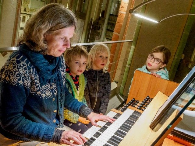 So beginnt die Orgelakademie von Nanette Günther. Während sie spielt, bleiben die Kinder unten und suchen sich ihren eigenen Hörplatz. Es geht nicht nur ums Zuhören. „Ich empfehle ihnen, auch darauf zu achten, ob sie etwas sehen – Farben, einen Regenbogen oder vielleicht eine schöne Stadt“, sagt sie.