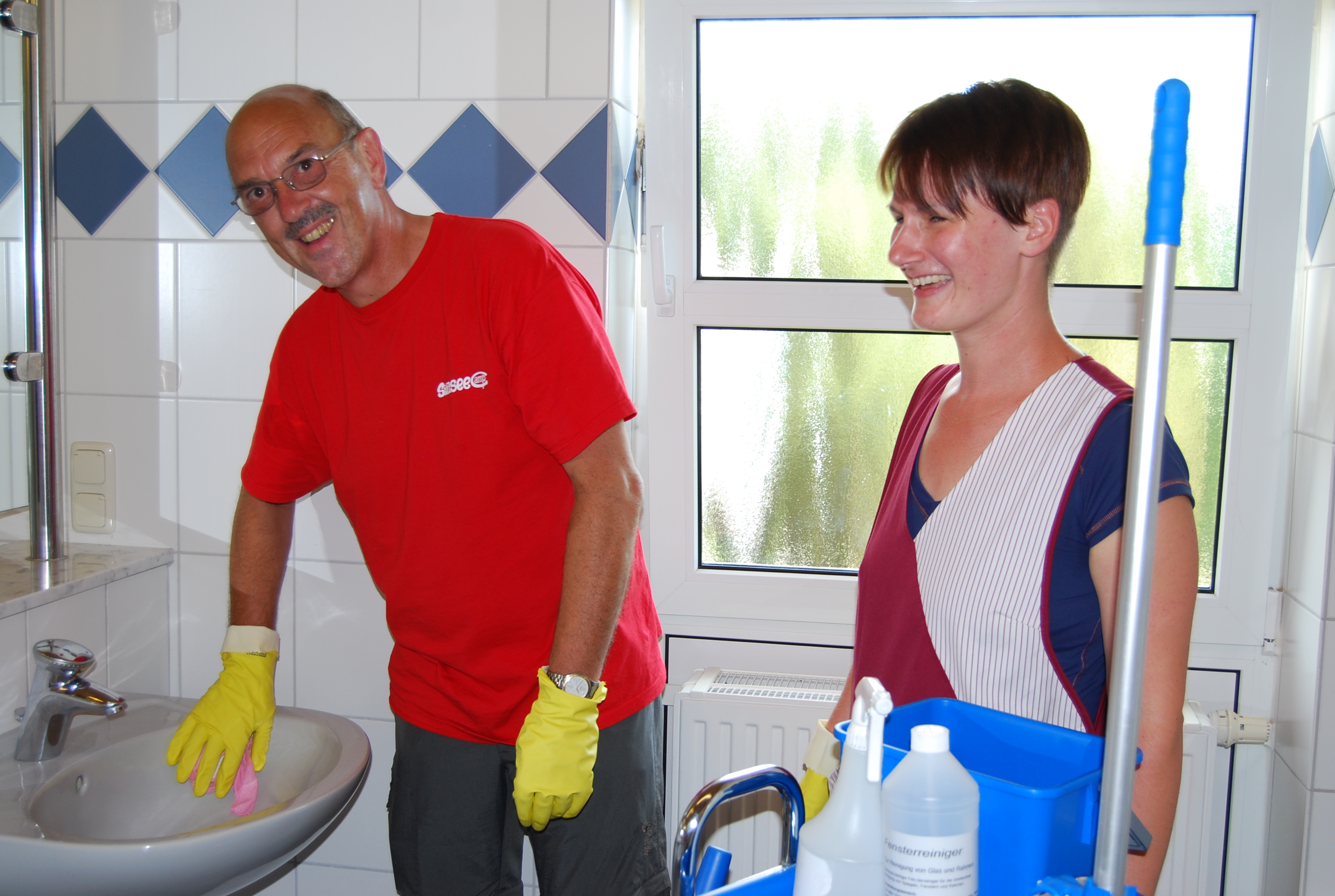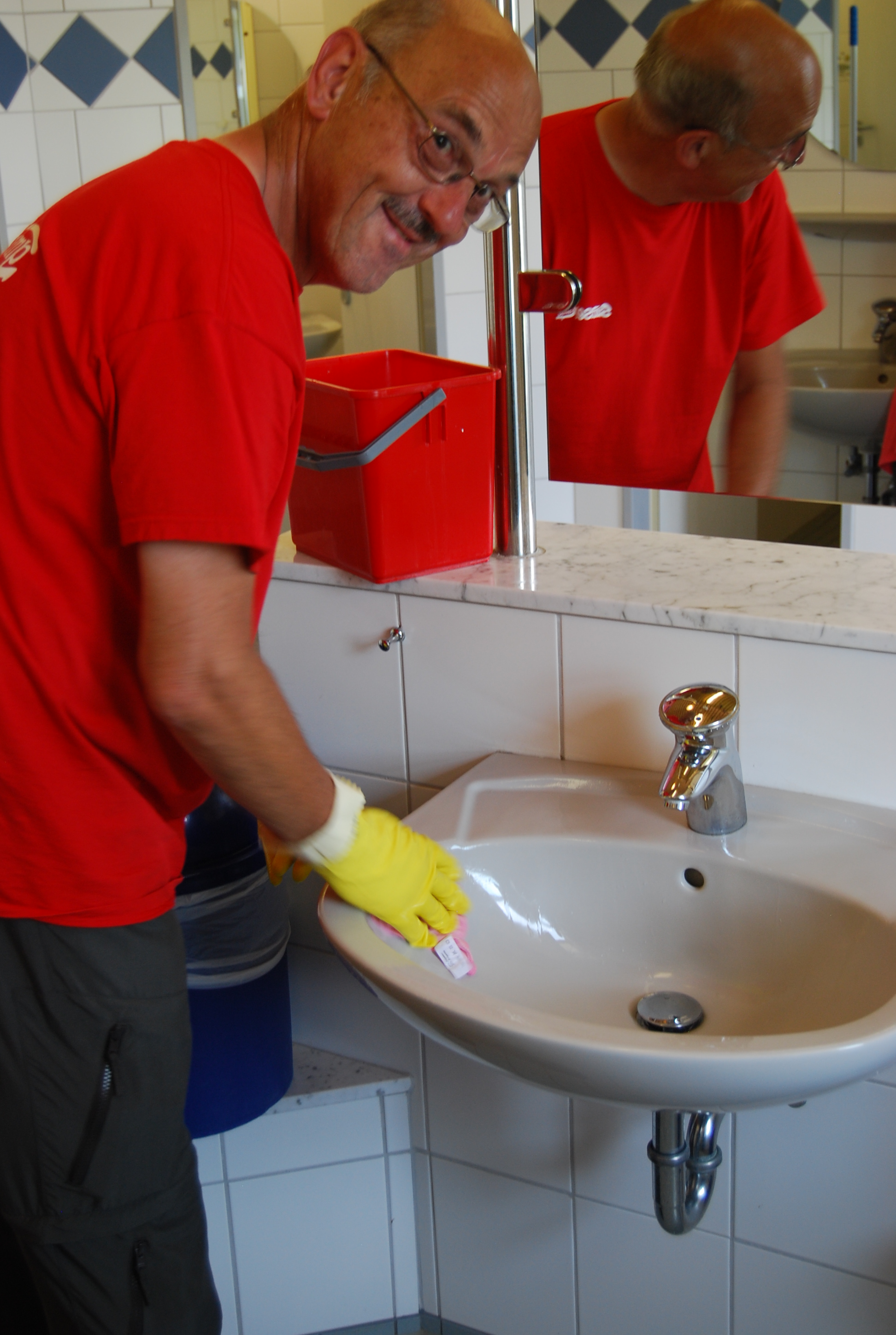 „Ich finde es gut, dass mal jemand sieht, dass das hier richtig Arbeit ist“, sagt Jenny Koschmann mit Blick auf ihren Praktikanten Dieter Rathing. Seit 4 Uhr in der Frühe hat der Lüneburger Landessuperintendent zusammen mit der Reinigungsfachkraft des Campingparks Südseecamp die Waschhäuser versorgt, dabei Toiletten, Duschen und Waschbecken geputzt. Nach vier Stunden Arbeit und einer Stunde Pause ging es um 9 Uhr weiter. „Da haben wir von vorne angefangen“, sagt Koschmann. Für Dieter Rathing hat die Fachfrau nur lobende Worte: „Er hat wirklich sehr gut gearbeitet.“