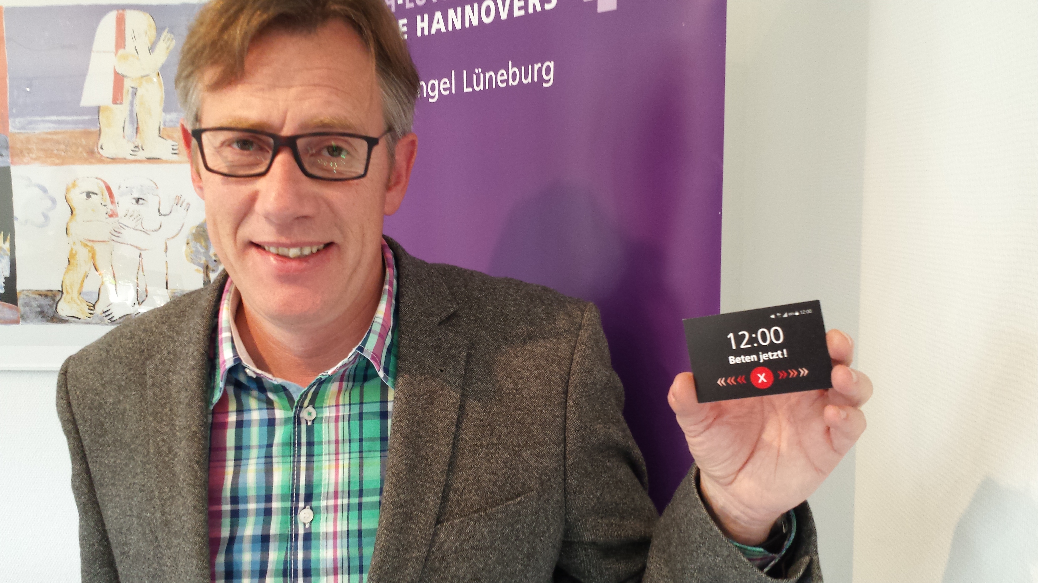 Wolfsburg/Lüneburg. Die Signalstärke deutet auf besten Empfang hin, auch das „Ton-an“-Symbol ist zu erkennen. Die Gestaltung des Kärtchens erinnert an einen Smartphone-Wecker: „12:00 – Beten jetzt!“ steht darauf zu lesen. Neuerdings lädt die Initiative „Christen bei Volkswagen“ auf der Höhe des Tages zum Innehalten ein. Pastor Peer-Detlev Schladebusch vom Kirchlichen Dienst in der Arbeitswelt (KDA) stellte die Idee jetzt bei einem Treffen von Mitarbeitenden im Sprengel Lüneburg vor.