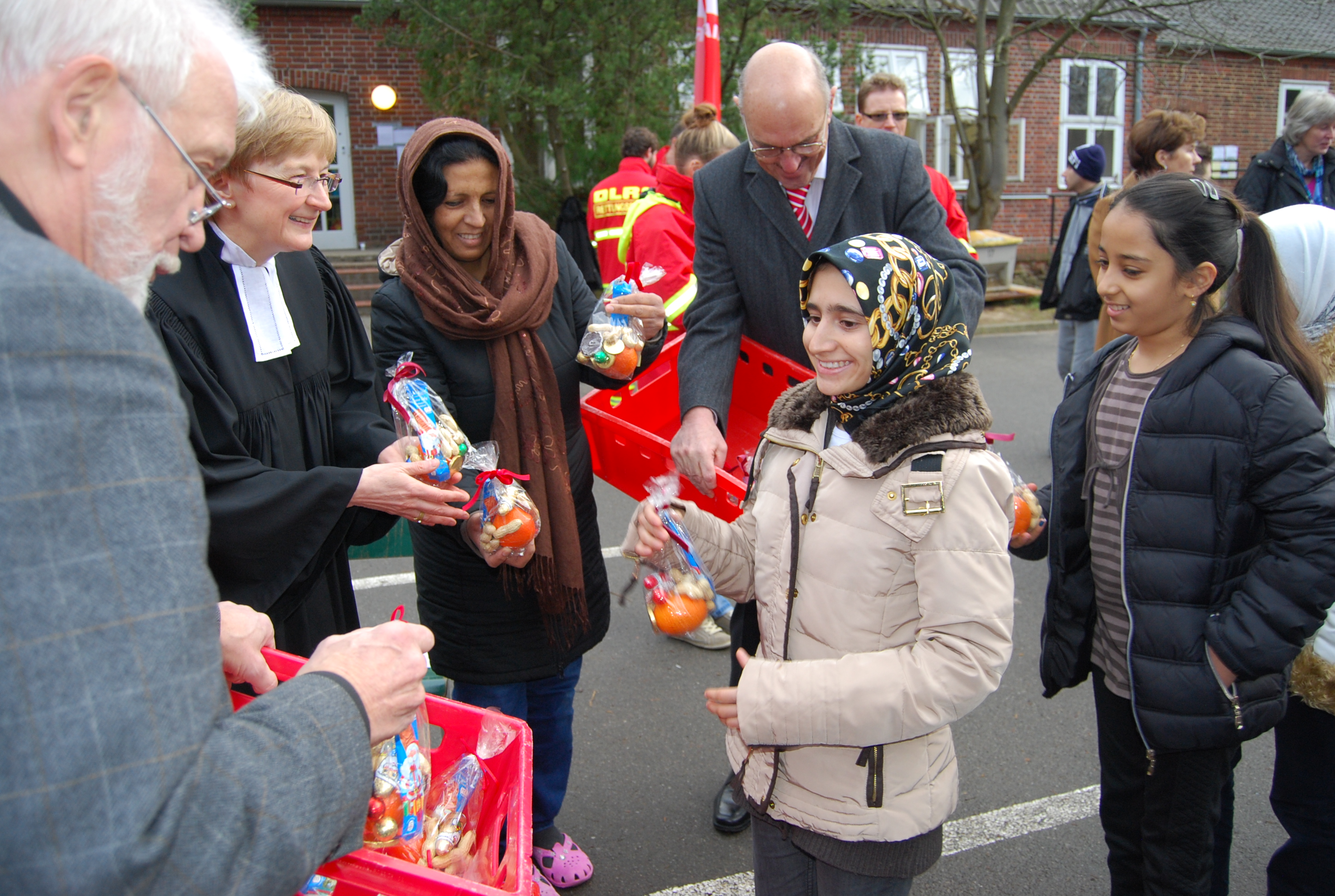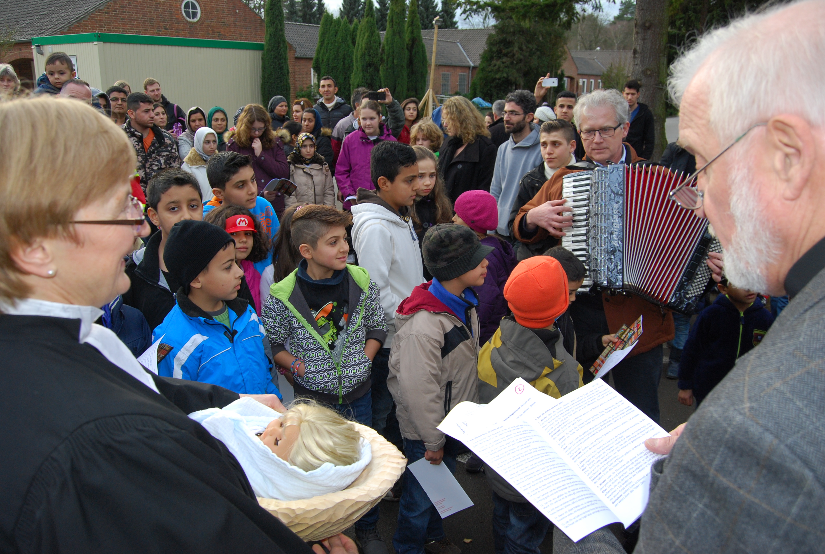 Um den Blick auf einen geschmückten Weihnachtsbaum freizugeben, war extra noch ein Drahtzaun entfernt worden. Dann wird „Ihr Kinderlein, kommet“ angestimmt, ein einheimischer Akkordeonspieler und ein Gitarrist aus der Unterkunft begleiten den Gesang. Im Wechsel mit Uelzens früherem Propst Wolf von Nordheim liest Superintendentin Schmid die biblische Weihnachtsgeschichte, in deutscher und englischer Sprache. Ein Dolmetscher übersetzt sie ins Arabische. Nicht nur die Helfer singen anschließend „Stille Nacht, heilige Nacht“. Auch einige der Flüchtlinge versuchen, den für sie kryptischen Zeichen im Liederheft ihre Stimme zu geben.
