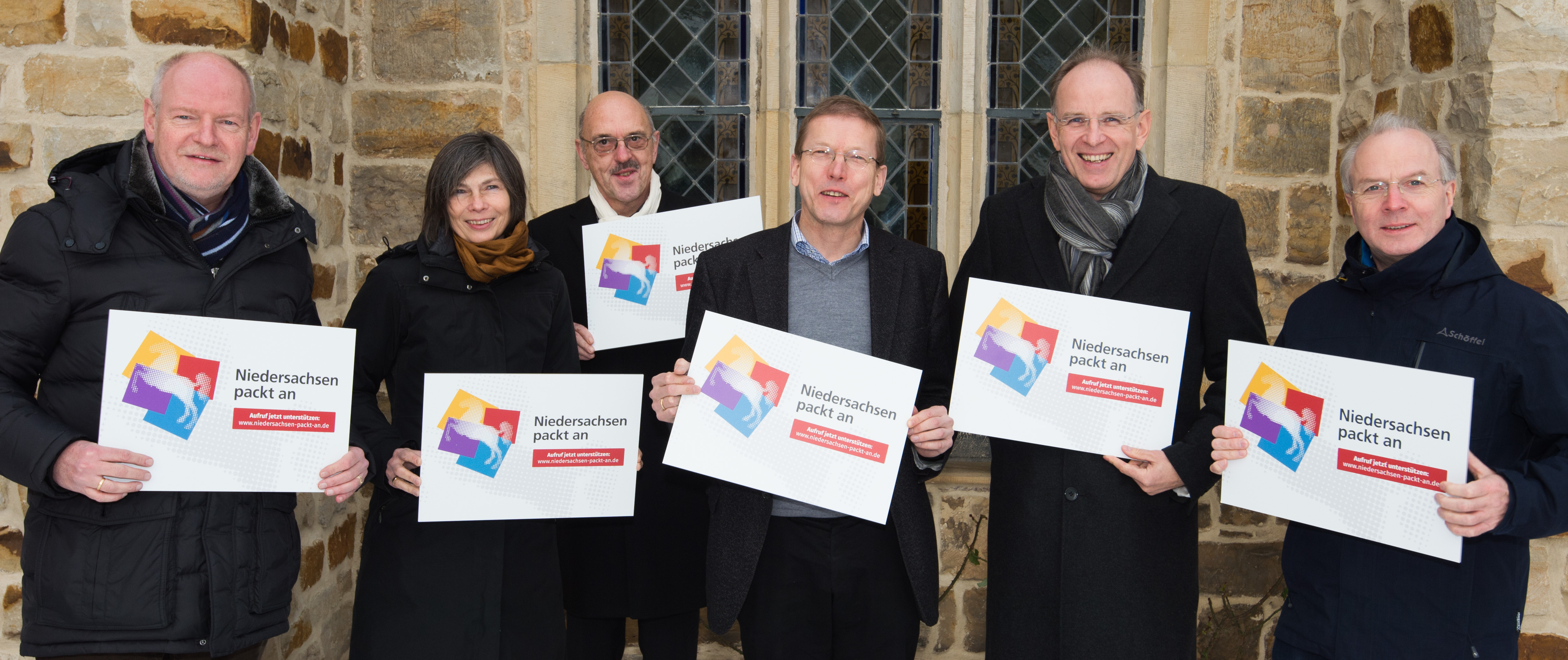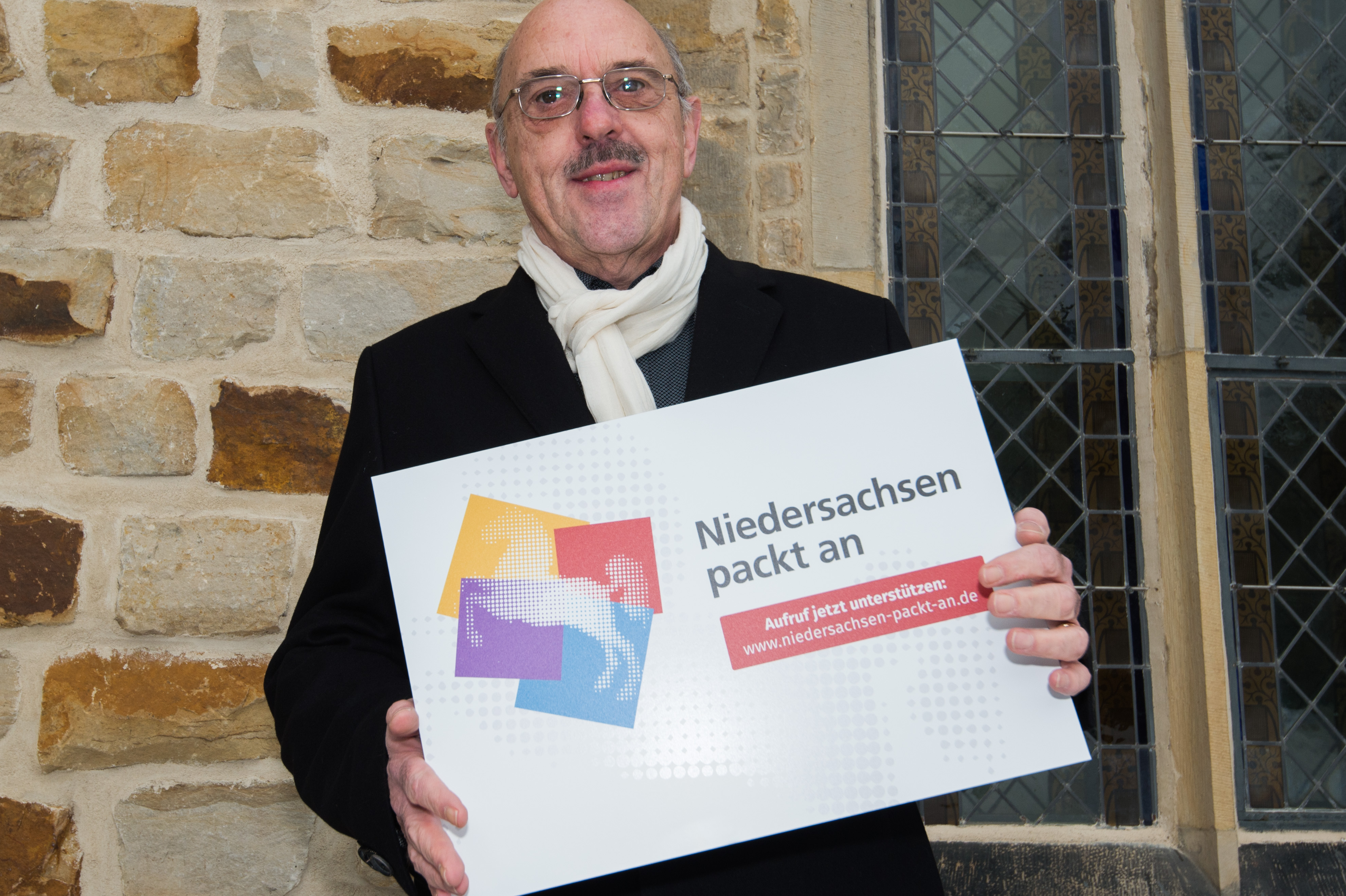 Gemeinsam haben die niedersächsische Landesregierung, die Kirchen, Gewerkschaften und Unternehmerverbände das Aktionsbündnis "Niedersachsen packt an" zugunsten von Flüchtlingen gegründet.