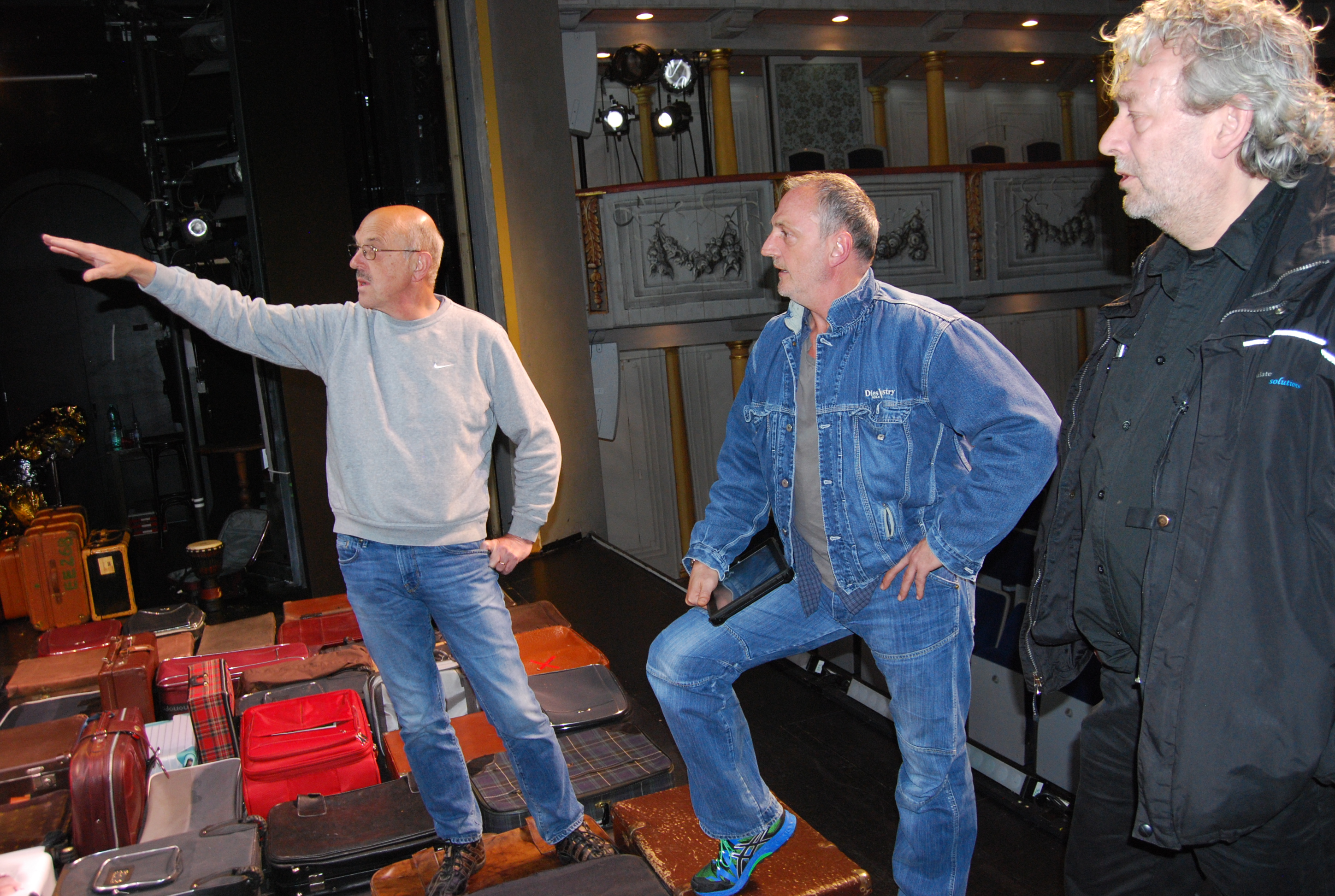 Zuvor hatte Rathing die aus ungezählten Koffern bestehende Bühne mit aufgebaut. Danach erklärte Beleuchtungsmeister Tilo Tauscher seinem prominenten Praktikanten die Lichttechnik und die Abfolge der insgesamt mehr als 35 „Stimmungen“.