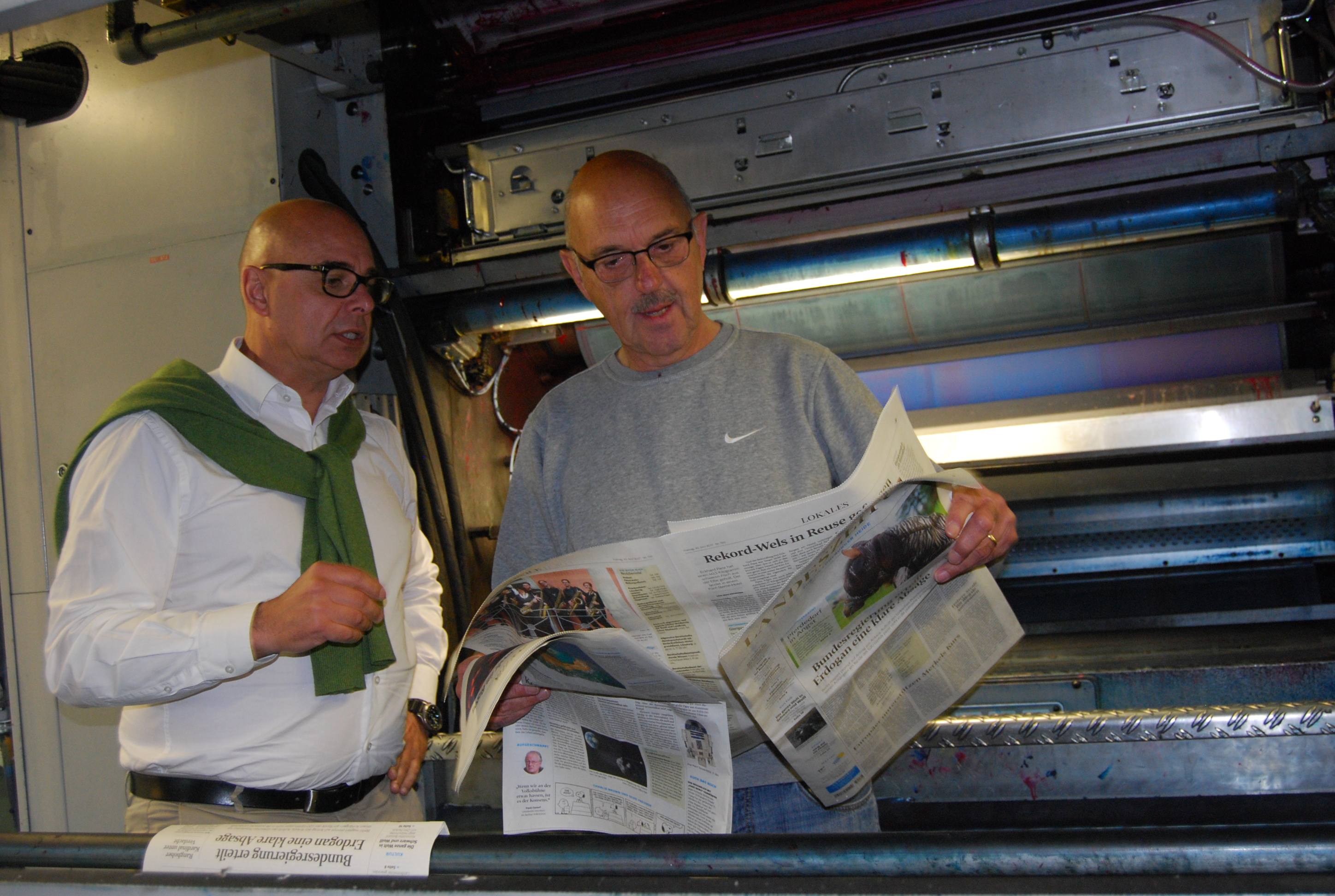Geschäftsführer Andreas Jörß hatte für seinen prominenten Praktikanten ein anspruchsvolles Programm zusammengestellt. Nach einer Betriebsführung konnte der Regionalbischof unter anderem Bereiche wie das Vertriebs- und Projektbüro oder die Druck-Vorstufe genauer kennenlernen. In der Rotation erlebte Rathing beispielsweise den Druck der Hamburger Morgenpost mit, bekam einen Einblick in die Maschinentechnik und in die Aufgaben der Versandabteilung.