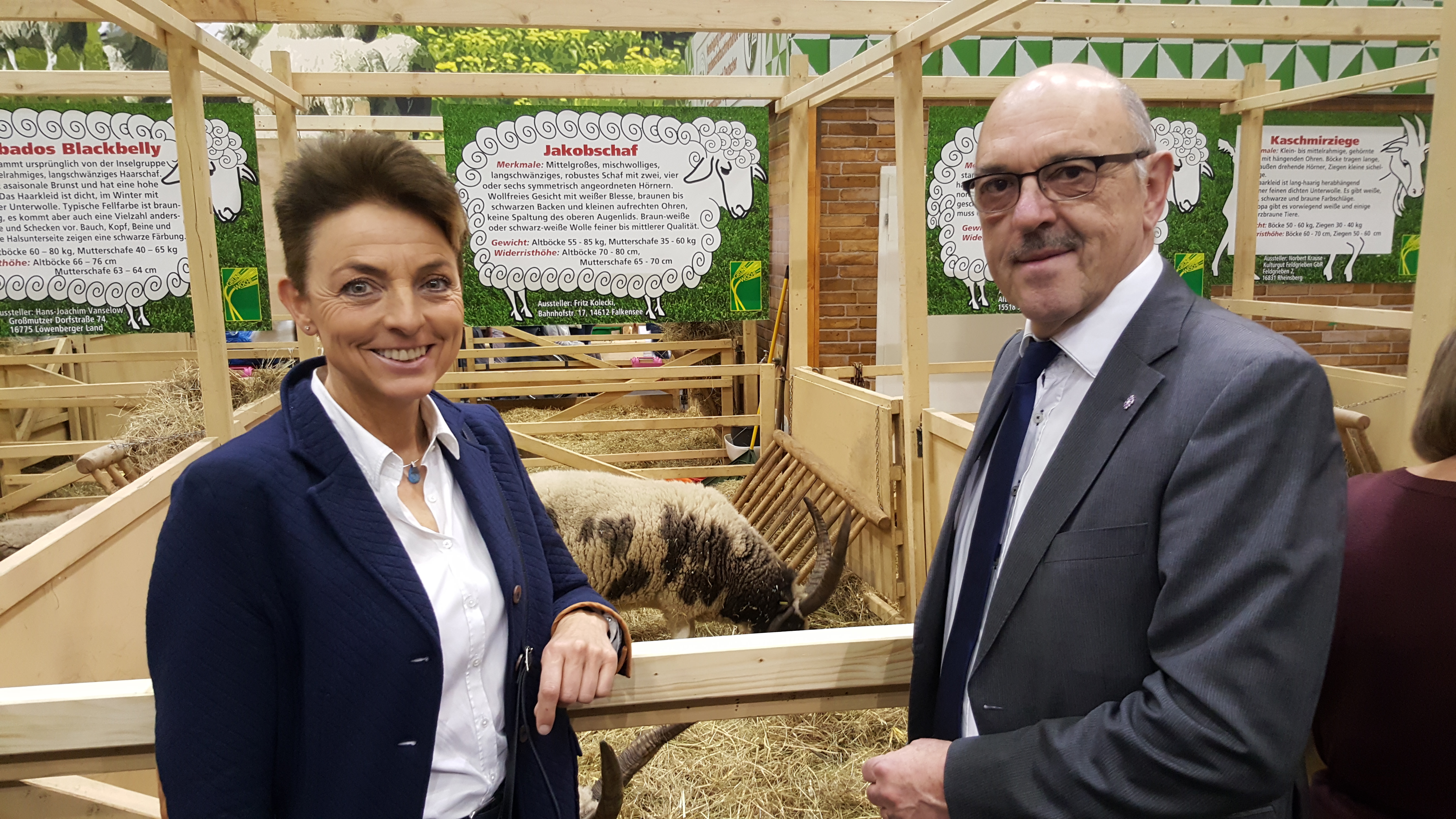 Zu den Ausstellungsschwerpunkten des DRV gehörte das Thema Tiertransporte. Ein begehbarer Tiertransporter bot den Besuchern einen Perspektivwechsel und vermittelte Regeln für tiergerechte Transporte. Ein Thema, das Dorit Stehr (Oldendorf), die Rathing auf seinem Rundgang begleitete, derzeit ganz besonders interessiert. Im November 2017 hatte das ZDF eine Fernsehdokumentation zu tierquälerischen Transporten quer durch Europa ausgestrahlt. Leider gebe es keine einheitlichen europäischen Regeln, beklagte Stehr, Leiterin des Referats Tierschutz im Niedersächsischen Landwirtschaftsministerium. Jenseits der europäischen Grenzen seien die Verhältnisse noch bedrückender. Für Deutschland gebe es indes strenge Regeln und die würden auch eingehalten. „Unsere Tiere kommen gut und entspannt an der Grenze an, davon habe ich mich mehrfach persönlich überzeugen können“, betonte Stehr.