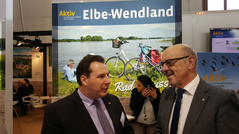 Alte Bekannte traf Landessuperintendent Rathing auf seinem Rundgang durch die Niedersachsenhalle am Gemeinschaftsstand Elbe-Wendland. „Wir wollen die Touristen des Elberadweges dazu einladen, bei uns Rast zu machen“, erläuterte Samtgemeindebürgermeister Christian Järnecke (Gartow) das Projekt Rad-Genuss. Zu den „Genusspunkten“ der Region gehören das Archezentrum in Amt Neuhaus, der Milchschafhof in Diahren sowie das Nemitzer Heidehaus.