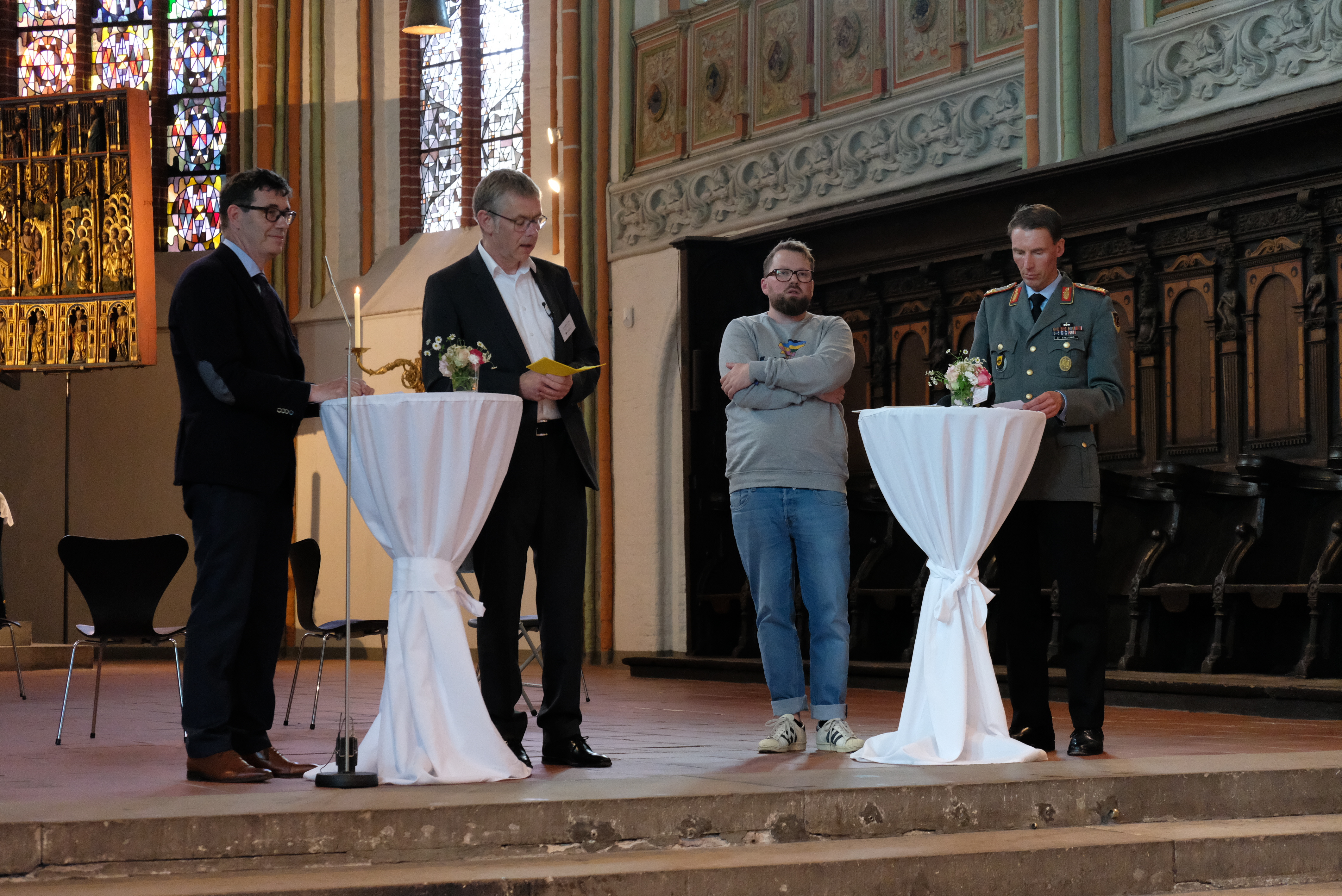 „Gewalt ist schrecklich, kann aber nötig sein, um Gewalt einzugrenzen“, positionierte sich Regionalbischof Stephan Schaede im anschließenden „friedensethischen Gespräch“ mit Brigadegeneral Christian Freuding und dem Friedensbeauftragten der Bremischen Evangelischen Kirche, Pastor Jasper von Legat. Es müsse beim Einsatz von Gewalt allerdings eine Perspektive zur Gewaltreduktion geben, nannte Schaede ein Gebot christlicher Ethik. Eine Forderung, der Freuding auch als Leiter des Lagezentrums Ukraine im Bundesverteidigungsministerium zustimmte: „Der Einsatz von Gewalt muss auf eine gerechte Friedensordnung in Europa gerichtet sein.“