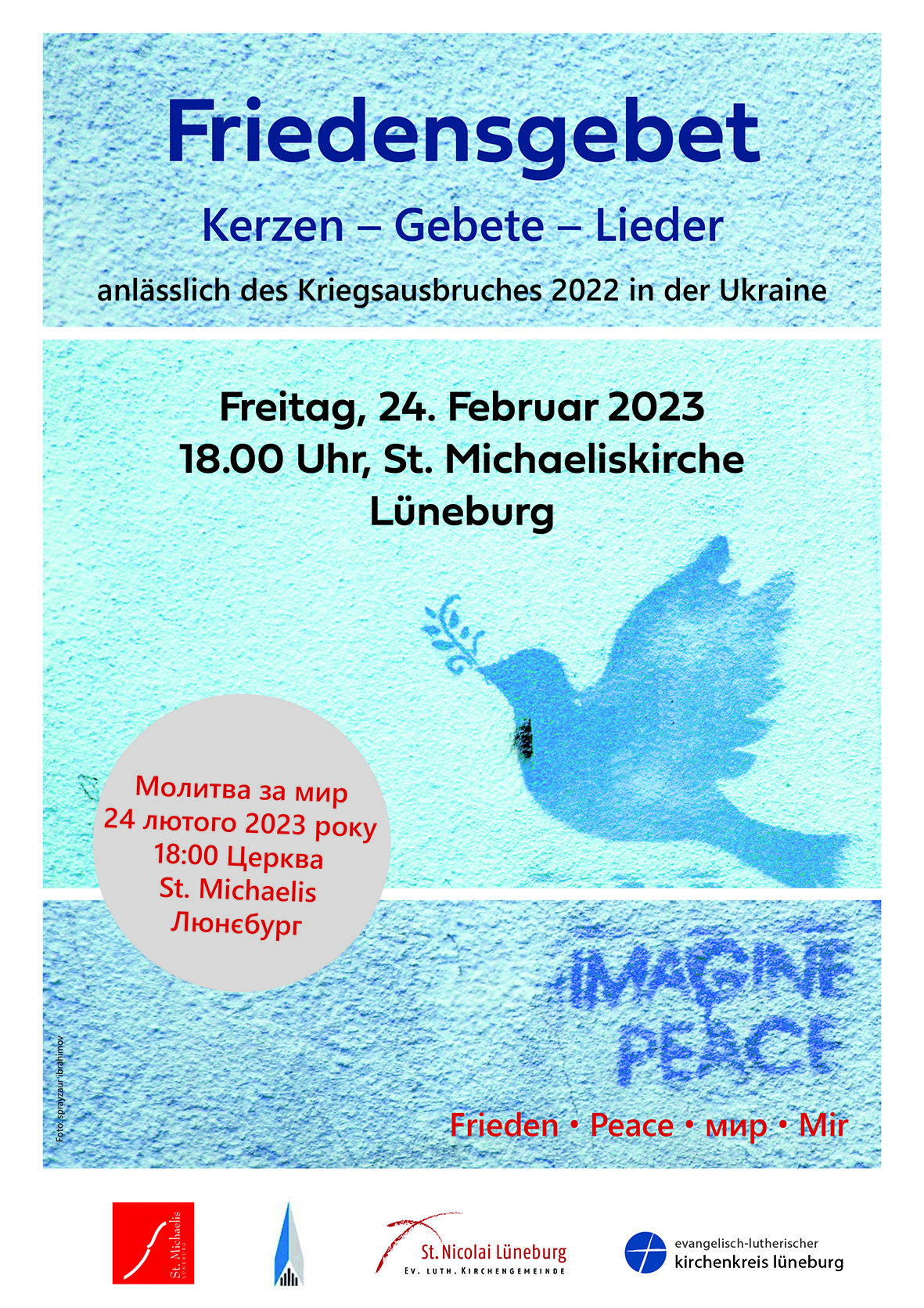 „Imagine Peace“- unter diesem Leitgedanken laden die Innenstadtkirchen Lüneburgs daher und der Ev. Kirchenkreis am Freitag, dem 24. Februar um 18 Uhr in St. Michaelis zu einer gemeinsamen Friedensandacht ein.