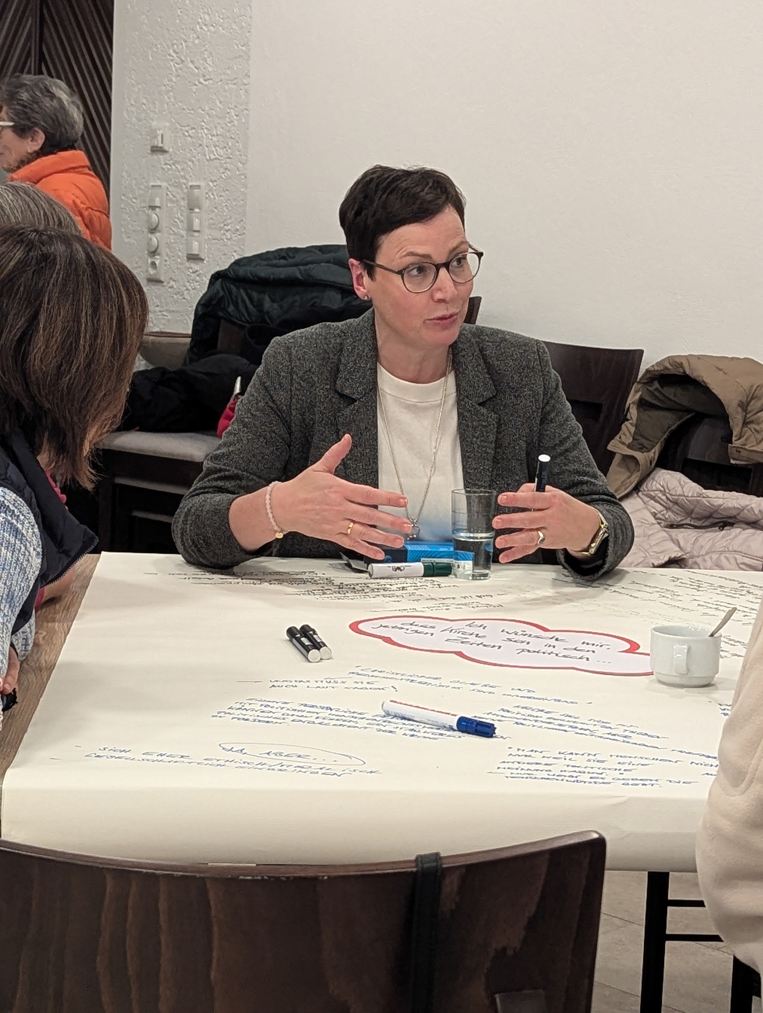 Bei ihrer Begrüßung betonte Gorka, wie wichtig der Dialog in diesem besonderen Format seiDialogs: „Ich freue mich, dass Sie da sind und offensichtlich bereit sind, sich heute Abend auf ein Experiment einzulassen. Das Weltcafé ist eine Methode, Menschen miteinander ins Gespräch zu bringen, und wir möchten Sie einladen, Ihre Anregungen und Geschichten mit uns zu teilen.“