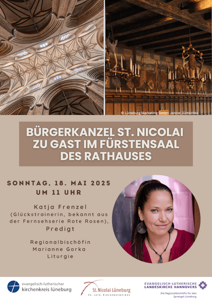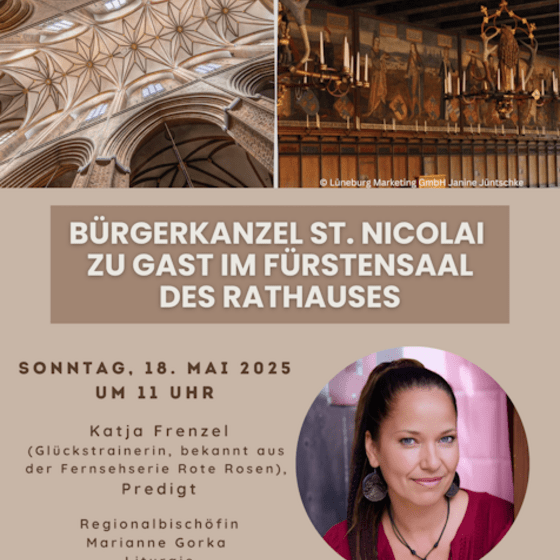Die Bürgerkanzel gestalten Regionalbischöfin Marianne Gorka und die Schauspielerin und Glückscoachin Katja Frenzel. Musikalisch wir der Gottesdienst von Christiane Frey, Querflöte, und Stefan Metzger-Frey, Klavier, sowie der Kantorei St, Nicolai begleitet. Die Liturgie verantwortet Pastorin Almuth Wiesenfeldt. Die Veranstaltung steht unter dem Thema „Darf ich glücklich sein, wenn die Welt leidet? – Wie Glückswellen die Welt verändern können“ und lädt Bürgerinnen und Bürger zu Reflexion und Partizipation in der Gemeinschaft ein.